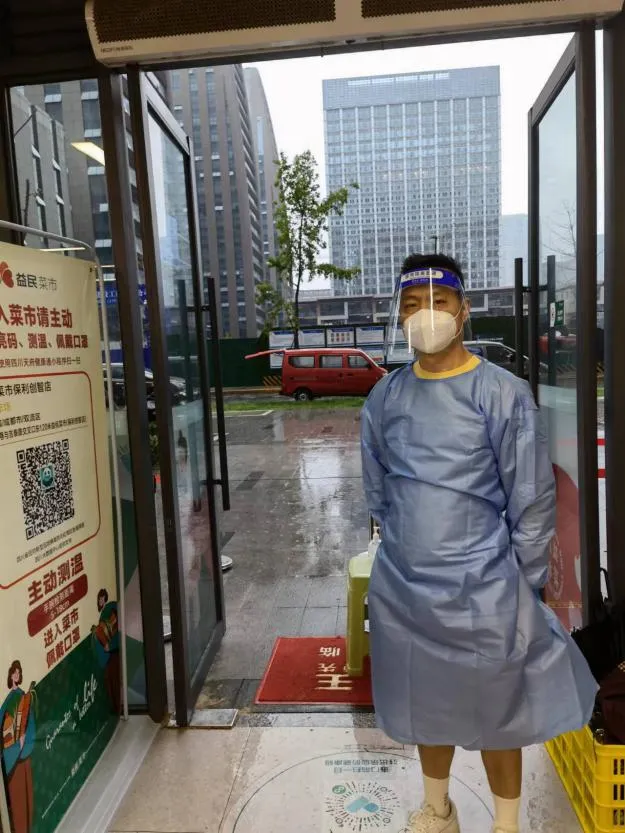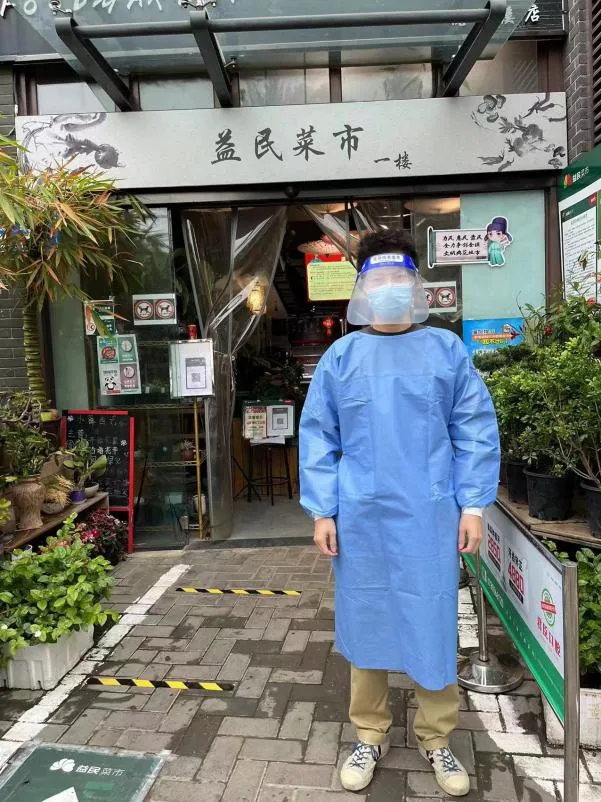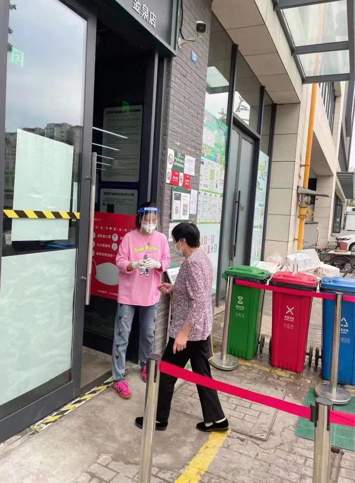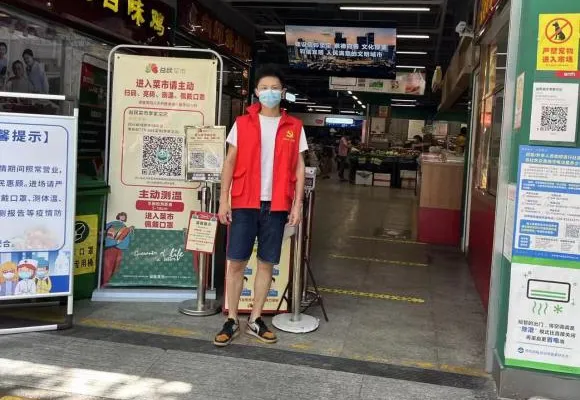同时,他也参与了益民菜市支援。由于蔬菜、食品等生活必需物资需求量较大,益民菜市人流量相对较多、情况也更为复杂,他必须站在门店门口,严格对进店购物的市民扫码测温,查验健康码、核酸信息,引导市民有序购买生活必需品。