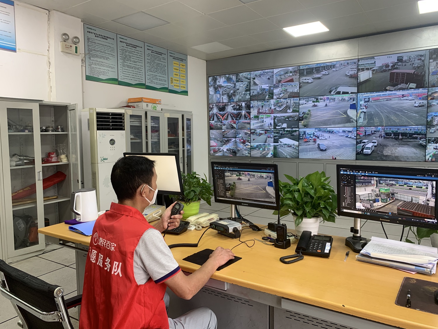 不停调取各个地区的监控实时画面,观察路口防疫举措、车辆通行、消防安全等等问题,一旦发现异常情况及时呼叫现场人员前去排查。