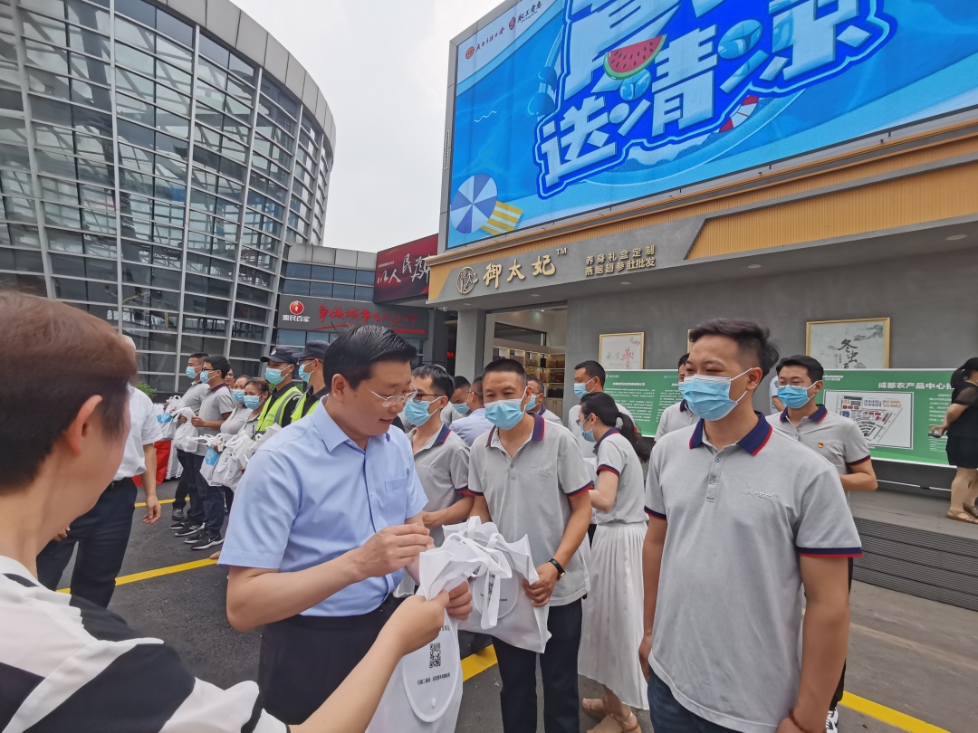 在成都农产品中心批发市场,吴凯一行慰问了奋战在一线的干部职工代表,为他们送去金银花、菊花等防暑降温清凉包,叮嘱大家注意安全,做好防暑降温,并感谢广大干部职工为保障成都市“菜篮子”做出的努力,希望大家以更加饱满的状态和热情投入到工作中,不断满足市民高品质生活需要。吴凯还实地调研成都农产品中心批发市场、益民菜市汇彩园店,详细了解菜市场更新改造提升、消费扶贫、食品安全等方面的情况。