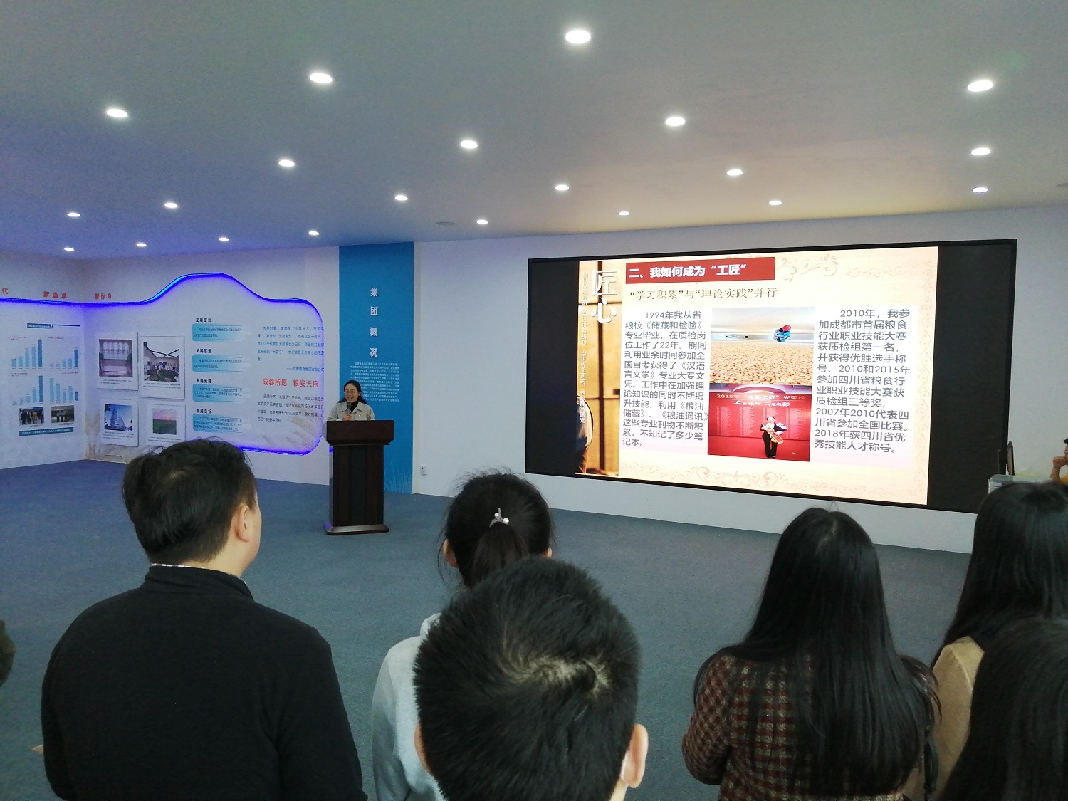 在成粮集团青白江仓储,学员参观了大茂丰公司文化展示厅、粮油装卸区域以及低温粮仓,实地走进“天府粮仓”。同时,“成都工匠”、大茂丰公司仓储服务部部长李英琼做工作分享,用自己的亲身经历告诉年轻人什么叫做“工匠精神”。