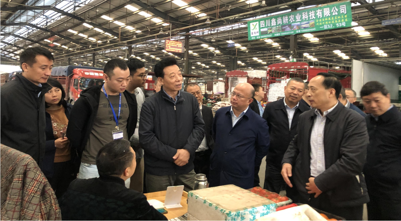 2020 年 10 月 25 日上午,全国政协提案委员会副主任委员、中央编办原副主任李晓全,全国政协农业和农村委员会委员、农业农村部原党组成员、原中央纪委驻农业部纪检组组长宋建朝一行赴濛阳市场调研农产品质量安全工作。 农业农村部农产品质量安全监管司副司长黄修柱,民革中央三农委委员、四川省内江市农业科学院副院长、民革内江市委副主委唐卫东等人员随行。省政协副秘书长陈雩桢,省农业农村厅总畜牧师赵勇,省农业农村厅质监品牌处处长李幼平,成都市政协副主席杨建德,成都市农业农村局局长张俊国,成都市农业农村局副局长姚光贵,彭州市委副书记张雄正、彭州市副市长龚昌华、彭州市农业农村局局长李世彬等陪同调研。