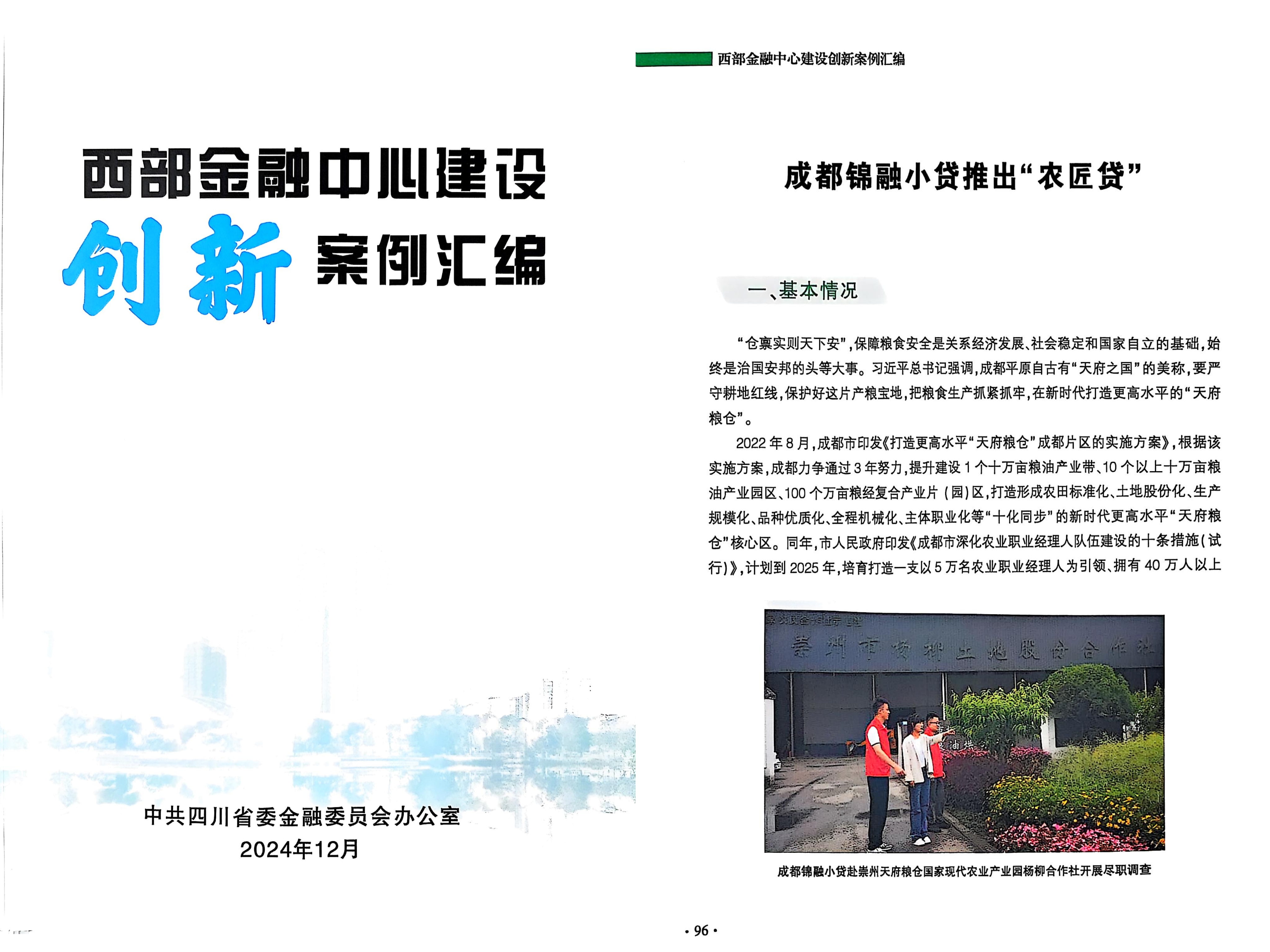 今年,“农匠贷”凭借在服务“三农”方面的突出贡献,成功入选省委金融办编印的西部金融中心建设创新案例汇编,成为全省唯一入选的小贷公司,也是全省四家入选的地方金融组织之一。同时,在海南举办的2025(第九届)中国品牌博鳌峰会上,锦融小贷与工商银行、哈尔滨银行并列获评“最佳普惠金融机构”,成为同届唯一入选的小贷机构。下一步,锦融小贷将持续扩大“农匠贷”在成都粮油主产区的覆盖广度和服务深度,同时创新优化更多惠农、助农的农村金融产品,不断提升品牌影响力,为更多农业经营主体提供更及时、更便捷的金融支持,助力打造新时代更高水平“天府粮仓”。